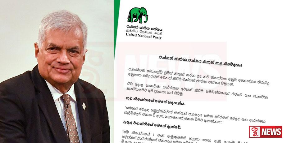 නිවේදනයක් නිකුත් කරන එක්සත් ජාතික පක්ෂය පවසන්නේ ඊට අදාළ සාකච්ඡා සාර්ථකව අවසන් කිරීම සම්බන්ධයෙන් රජයට සහ සාකච්ඡා කණ්ඩායමට ප්රශංසා කරන බවයි.