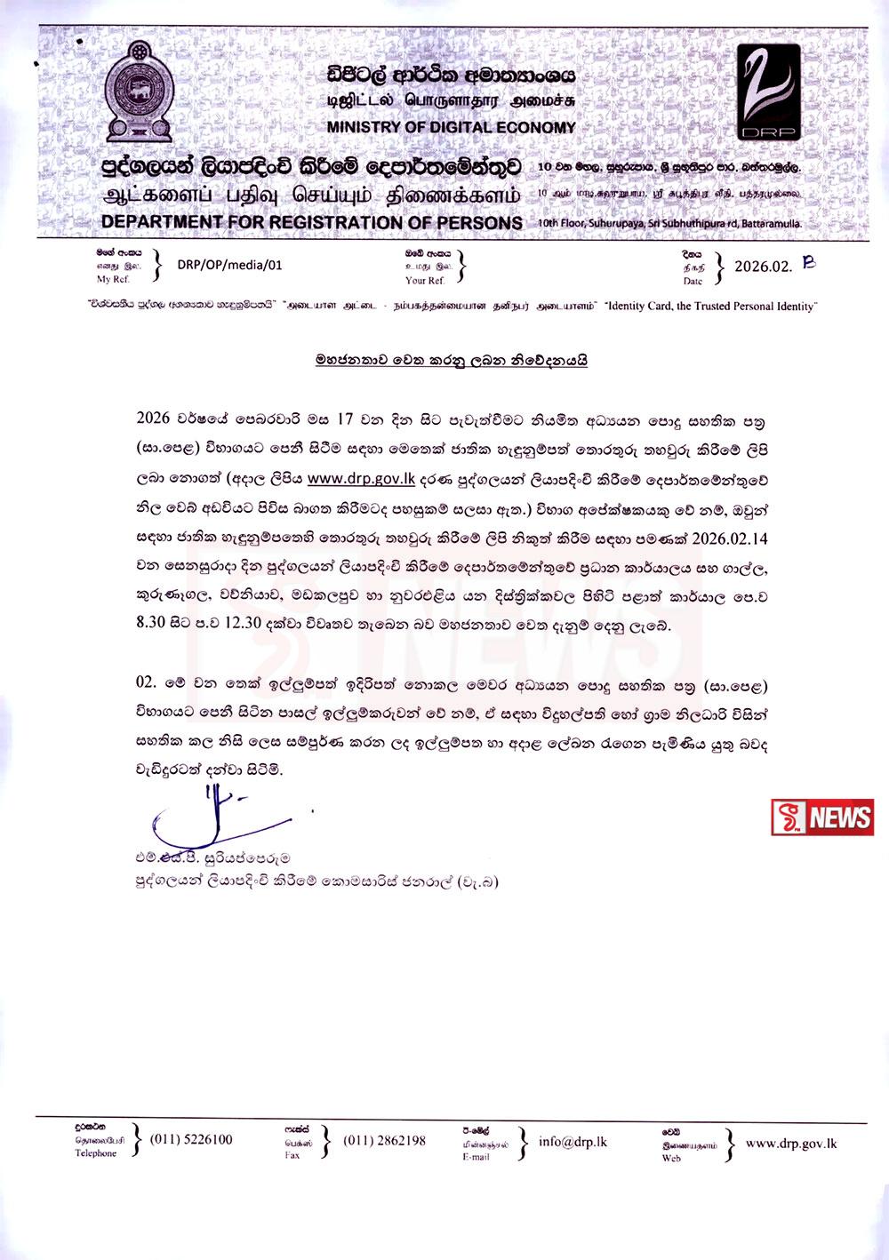 අදාළ නිවේදනය මගින් දැක්වෙන්නේ එළැඹෙන පෙබරවාරි මස 17 වන දින පැවැත්වීමට නියමිත අධ්‍යයන පොදු සහතික පත්‍ර සාමාන්‍ය පෙළ විභාගයට පෙනී සිටින අපේක්ෂකයන්ගේ ජාතික හැඳුනුම්පත් තොරතුරු තහවුරු කිරීමේ ලිපි නිකුත් කිරීම සඳහා මෙලෙස එම දෙපාර්තමේන්තුව විවෘත තැබෙන බවයි.