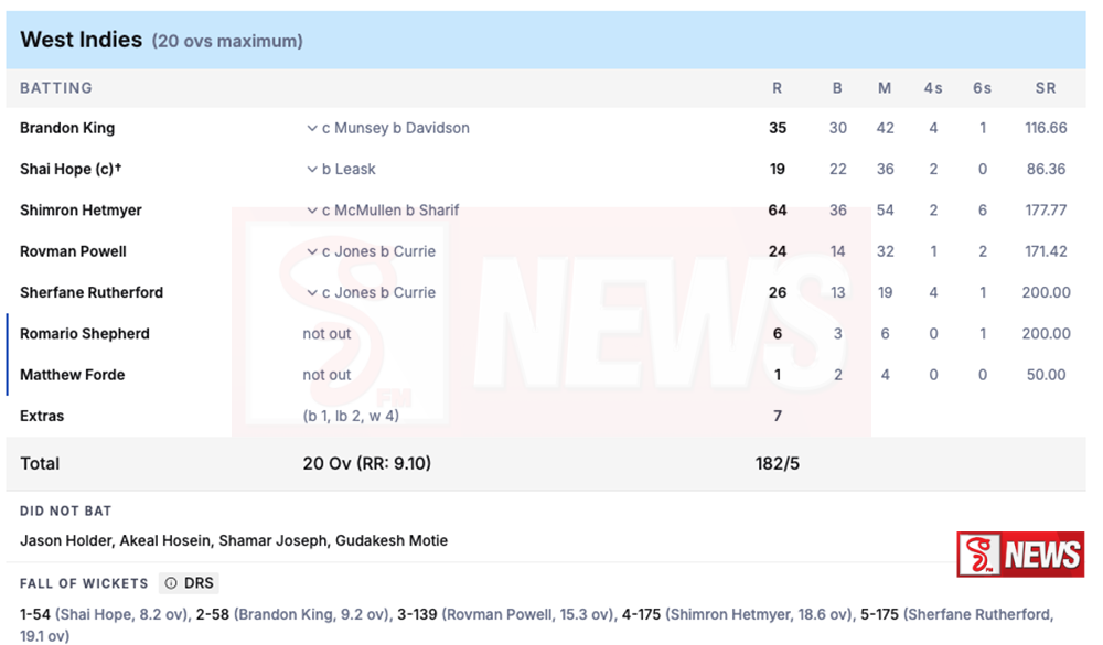 ඒ අනුව පන්දුවට පහරදීමට පිටියට පැමිණි බටහිර ඉන්දීය කොදෙව් ක්‍රිකට් කණ්ඩායම නියමිත පන්දුවාර 20 අවසානයේ කඩුලු 5ක් පමණක් දැවී ලකුණු 182ක් ලබාගැනීමට සමත් වූවා.