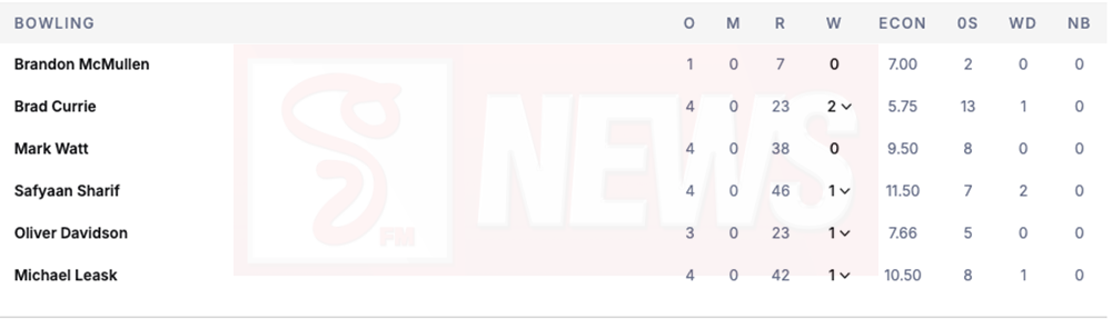 පන්දු යැවීමේදී ස්කොට්ලන්ත කණ්ඩායම වෙනුවෙන් Brad Currie කඩුලු දෙකක් දවා ගැනීමට සමත් වූ අතර Safyaan Sharif, Oliver Davidson සහ Michael Leask එක් කඩුල්ල බැගින් දවා ගැනීමට සමත් වූවා.