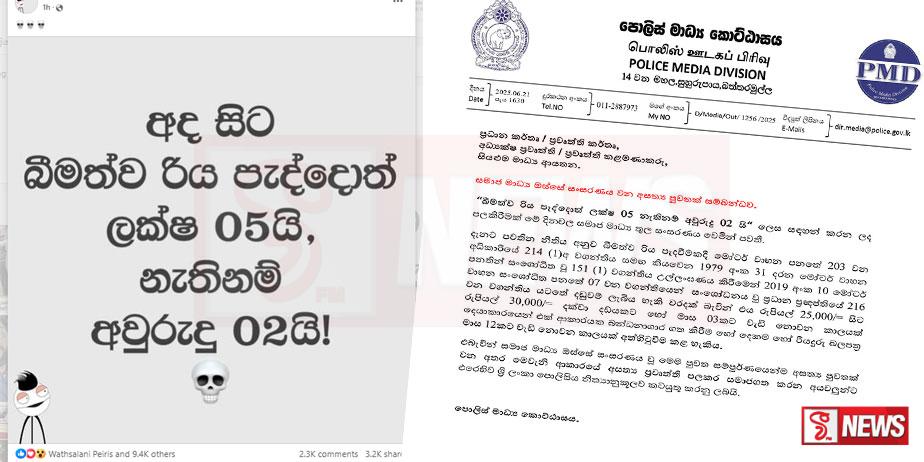 “බීමත්ව රිය පැද්දොත් ලක්ෂ 5 නැතිනම් අවුරුදු 2” යනුවෙන් සඳහන් කරමින් පුවතක් මෙම දිනවල සමාජ මාධ්ය ඔස්සේ සංසරණය වෙමින් පවතින බව පොලිසිය පවසනවා.