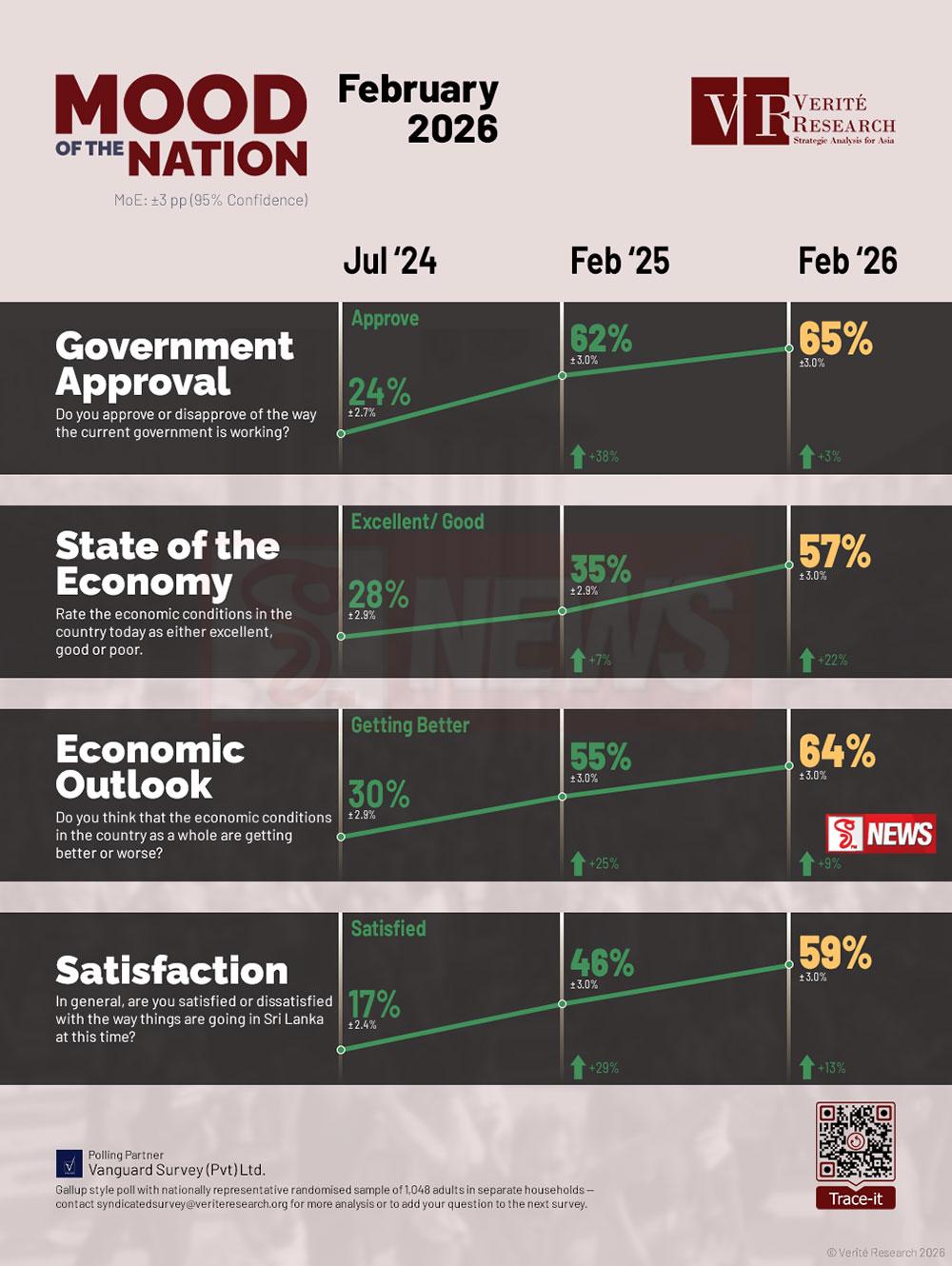 වේරිටේ රිසර්ච් (Verité Research) ආයතනය විසින් පවත්වනු ලබන ගැලප් (Gallup) මාදිලියේ “රට හිතන හැටි” (Mood of the Nation) නවතම මත විමසුමට අනුව, 2026 පෙබරවාරි මාසයේ මුල් භාගය වන විට ආණ්ඩුව ගැන ජනතා අනුමැතිය 65% ක් ලෙස වාර්තා වී ඇතැයි එම ආයතනය නිවේදනය කරයි.