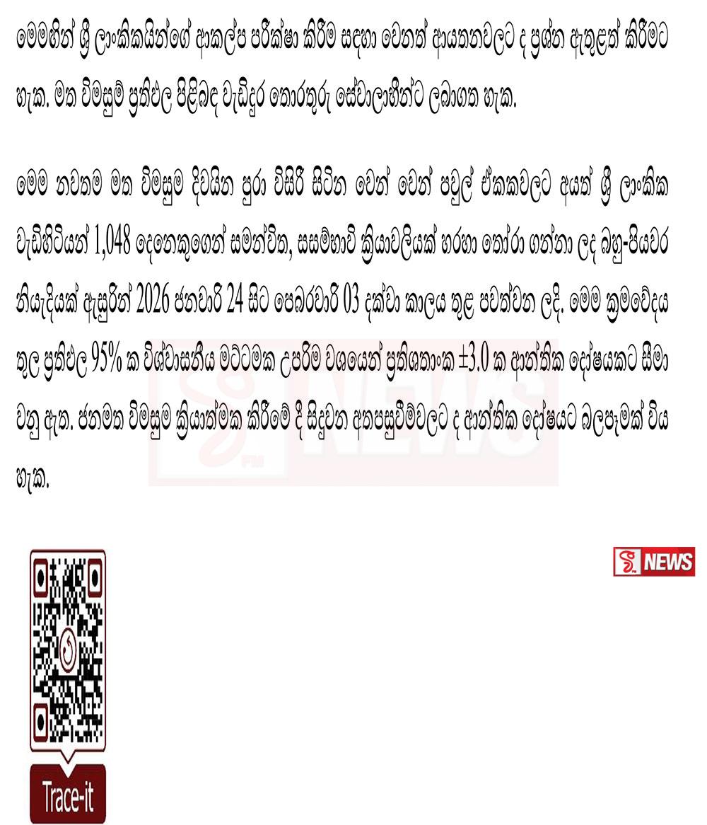 මෙම නවතම මත විමසුම දිවයින පුරා විසිරී සිටින වෙන් වෙන් පවුල් ඒකකවලට අයත් ශ්රී ලාංකික වැඩිහිටියන් 1,048 දෙනෙකුගෙන් සමන්විත, සසම්භාවි ක්රියාවලියක් හරහා තෝරා ගන්නා ලද බහු-පියවර නියැදියක් ඇසුරින් 2026 ජනවාරි 24 සිට පෙබරවාරි 03 දක්වා කාලය තුළ පවත්වන ලදි. මෙම ක්රමවේදය තුල ප්රතිඵල 95% ක විශ්වාසනීය මට්ටමක උපරිම වශයෙන් ප්රතිශතාංක ±3.0 ක ආන්තික දෝෂයකට සීමා වනු ඇත. ජනමත විමසුම ක්රියාත්මක කිරීමේ දී සිදුවන අතපසුවීම්වලට ද ආන්තික දෝෂයට බලපෑමක් විය හැක.