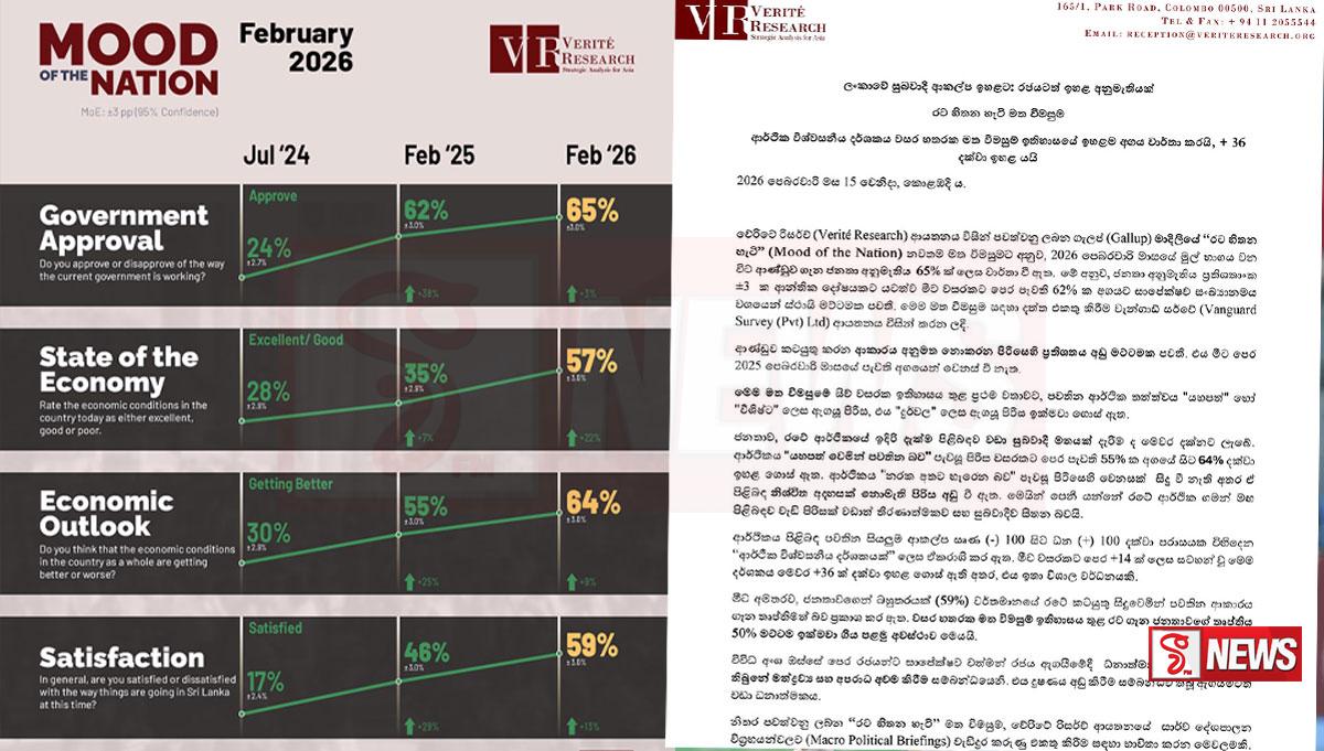 වේරිටේ රිසර්ච් (Verité Research) ආයතනය විසින් පවත්වනු ලබන ගැලප් (Gallup) මාදිලියේ “රට හිතන හැටි” (Mood of the Nation) නවතම මත විමසුමට අනුව, 2026 පෙබරවාරි මාසයේ මුල් භාගය වන විට ආණ්ඩුව ගැන ජනතා අනුමැතිය 65% ක් ලෙස වාර්තා වී ඇතැයි එම ආයතනය නිවේදනය කරයි.
