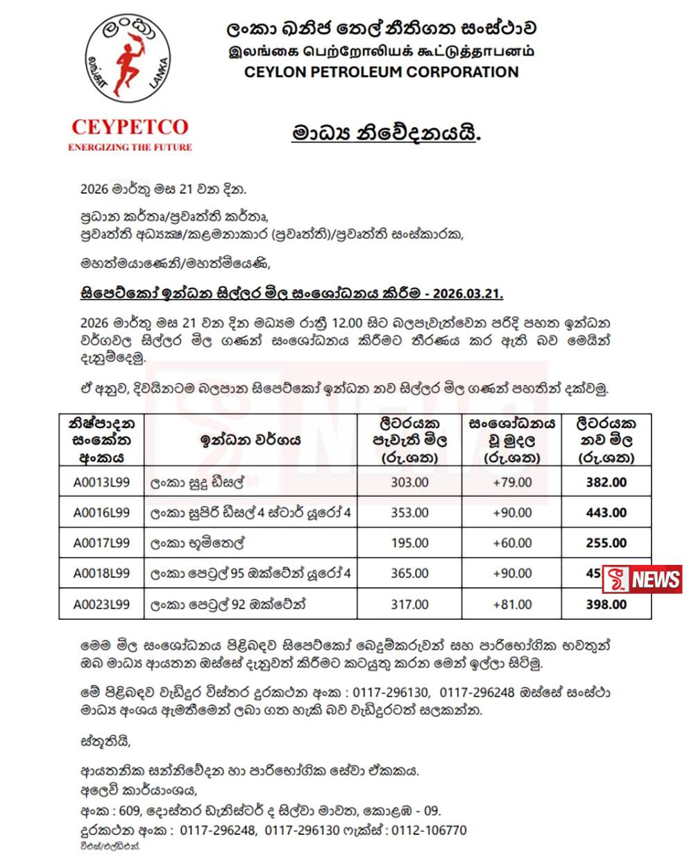 • BREAKING NEWS: ඉන්ධන මිල ඉහළට
